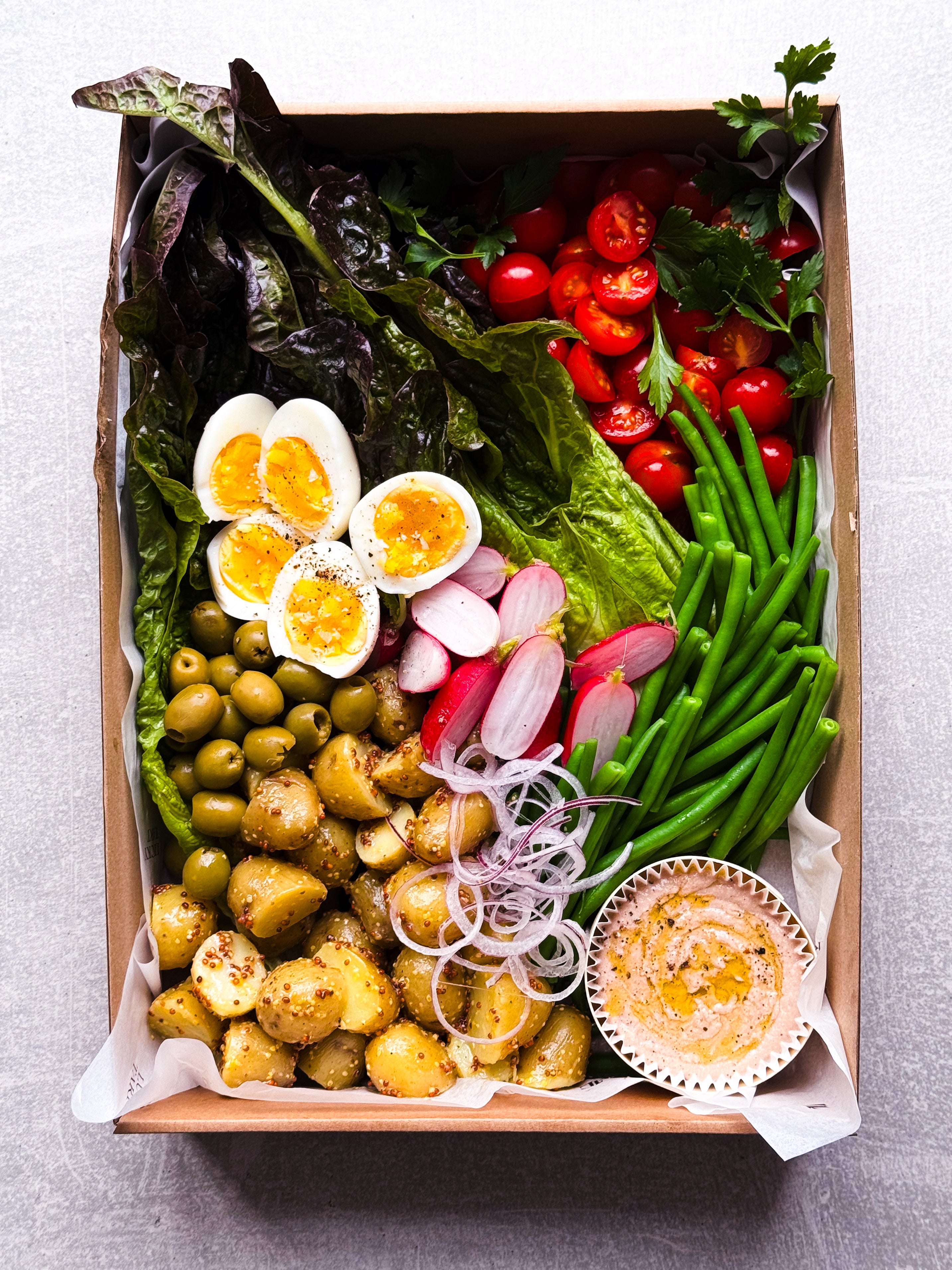 Nizzan salaatista riittää 6-8:lle hengelle ja jopa 12 annosta yhdistettynä muihin Lucky Tart -salaatteihin tai esim. minibriossien kanssa. Salaatti säilyy hyvänä kylmässä jopa 3 päivää. Tilaa sen kylkeen toiseksi salaatiksi joko kirkas Waldorf tai orzopastasalaattimme ja ateria on katettu!