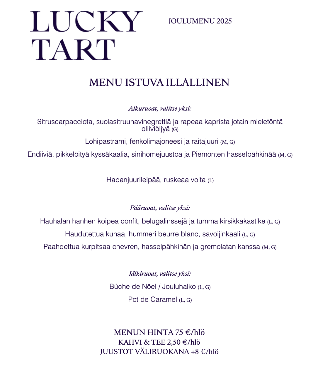 Marras-joulukuussa tarjoamme ensisijaisesti joulumenuta, joka ei kuitenkaan sisällä perinteisiä suomalaisia jouluruokia. Menuta suunnitellessamme mietimme: "Mitä haluaisimme tarjota omissa pikkujouluissamme?" Menu on voimassa 1.11.-20.12.2025