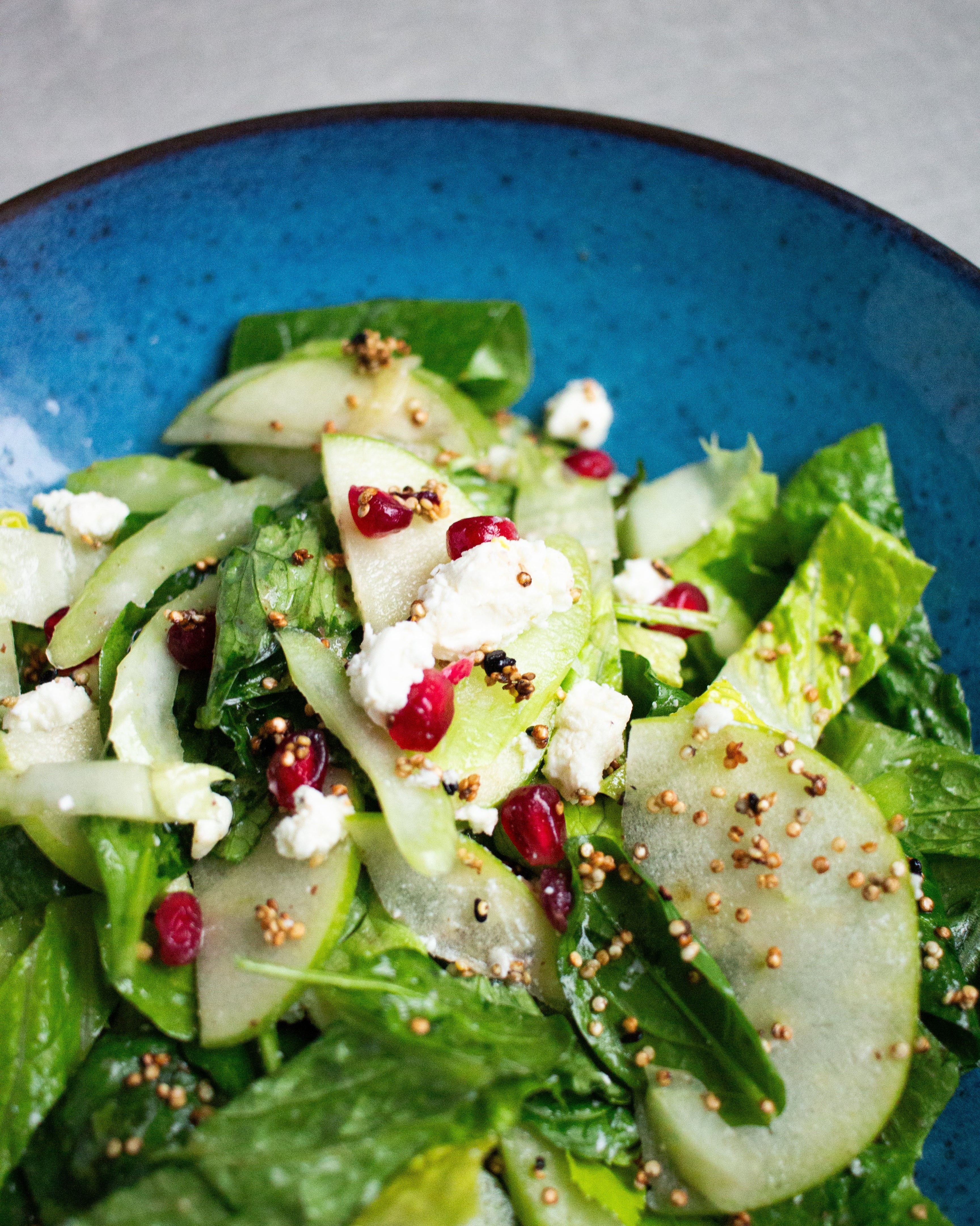 Kirkkaassa Waldorfinsalaatissamme on romaine- ja lehtisalaatteja, omenaa, varsiselleriä, granaattiomenan siemeniä, pekaanipähkinöitä, punasipulia, yrttejä, pehmeää vuohenjuustoa sekä quinoa-unikonsiemencrumblea.
