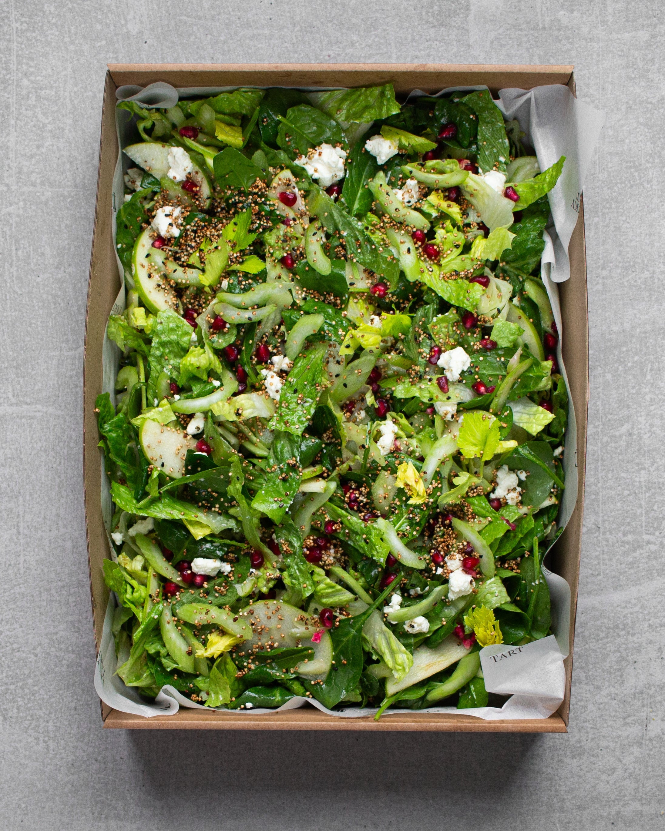 Waldorfsalaatti quinoacrublella tulee laatikossa ja on tarjoiluvalmis. Voit myös avata laatikon laidan saksilla ja sujauttaa salaatin haluamallesi tarjoiluvadille. Salaatti säilyy kylmässä 2 päivää.
